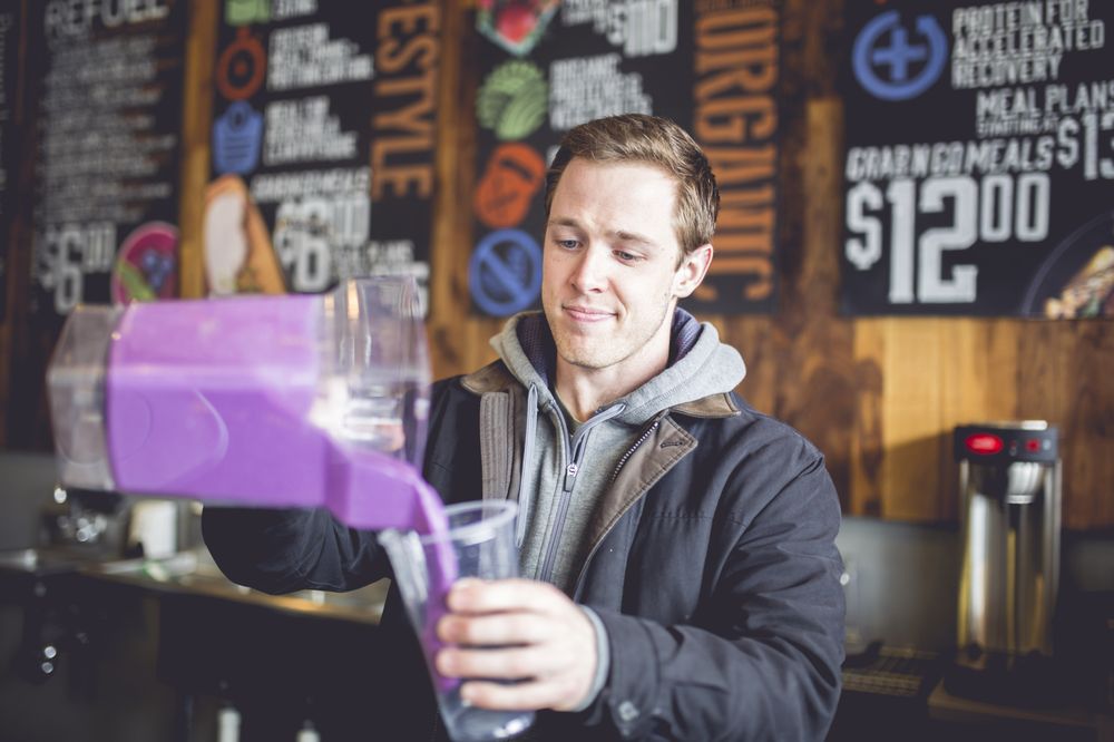 24oz. Almond milk, vanilla protein, blueberries, oats, grape aminos and peanut butter.